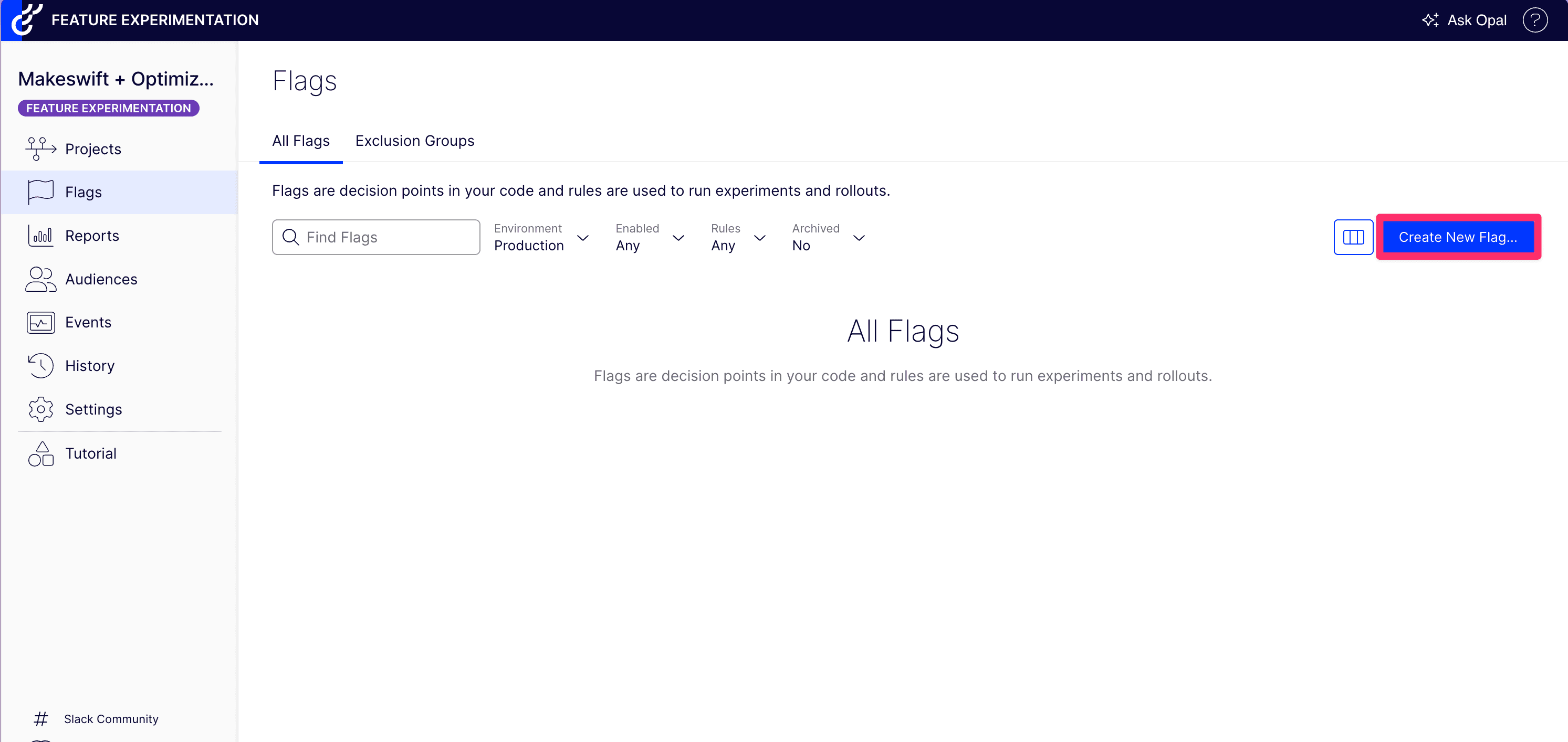 Within your project, you will then create a new flag. In Optimizely, a flag refers to a feature flag that allows you to control the visibility and functionality of specific features within your application. Flags enable you to implement A/B tests that automatically toggle features on or off for different users without needing to deploy new code.