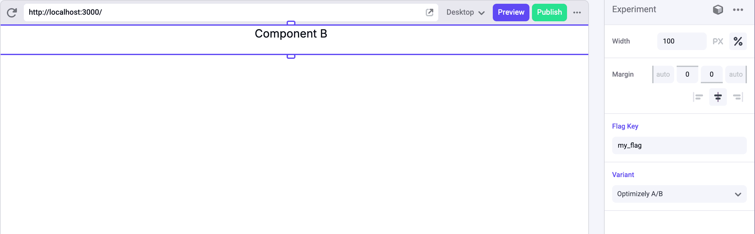 You will then need to use the same flag key name that was created in Optimizely, and assign it to the combobox input defined as Flag Key. The Optimizely A/B variacan then be selected so Optimizely controls the render.