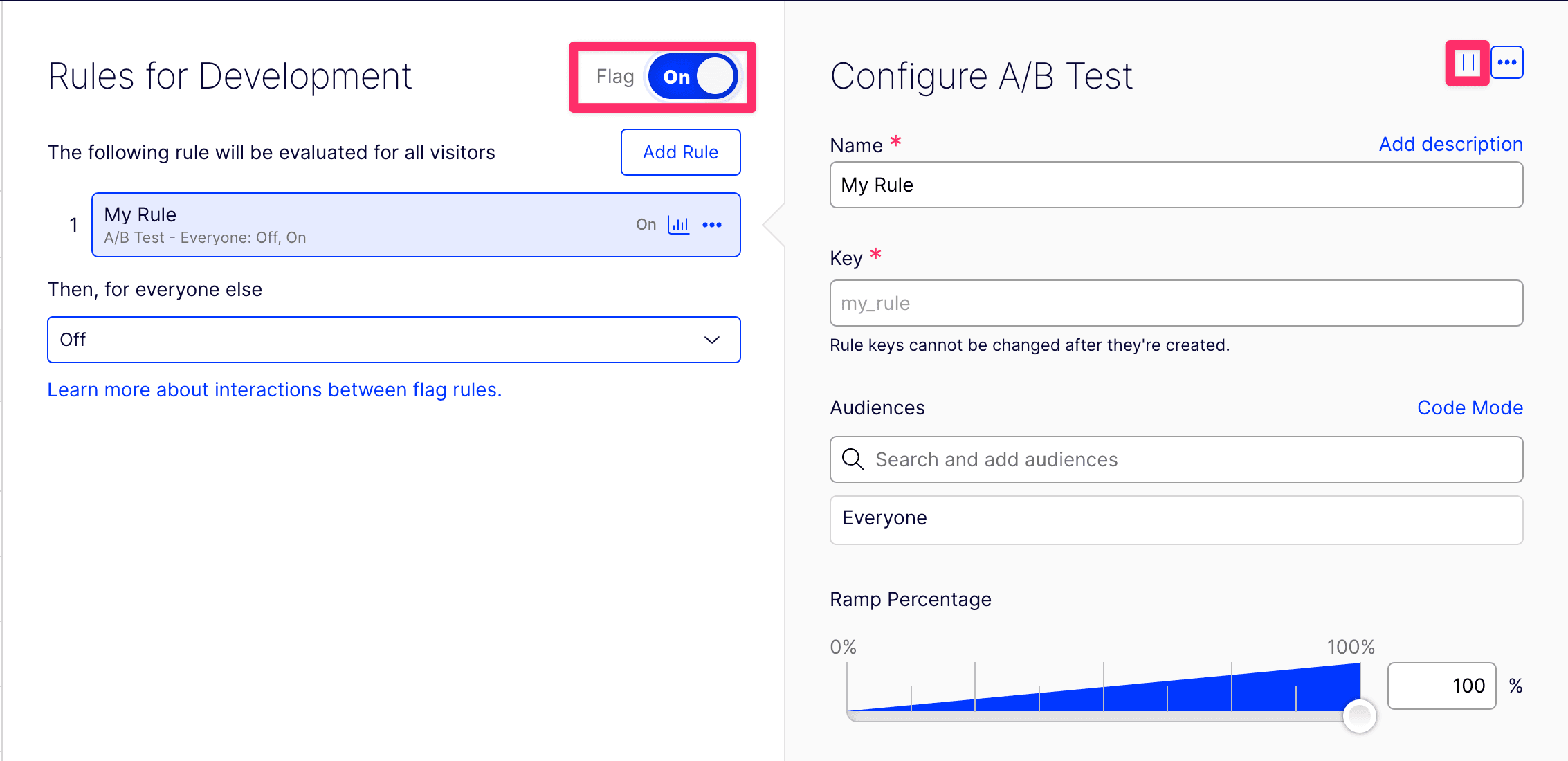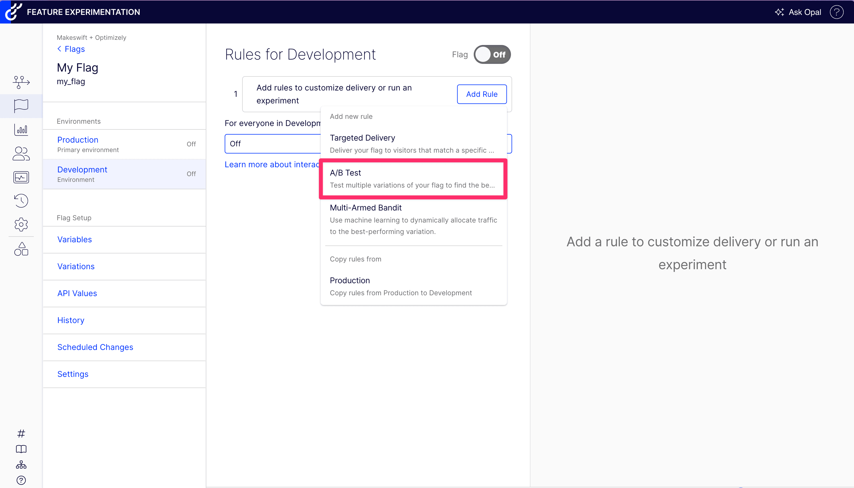 Once we have created and named the flag, we can then create a new Rule for A/B testing. You can do this by adding a rule and selecting A/B Test.