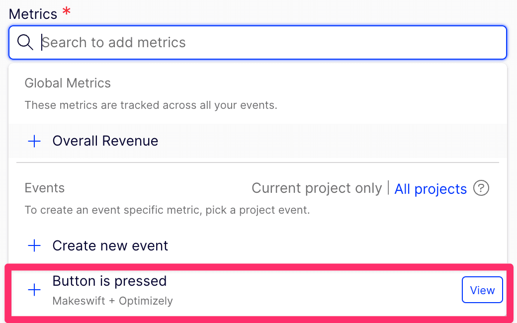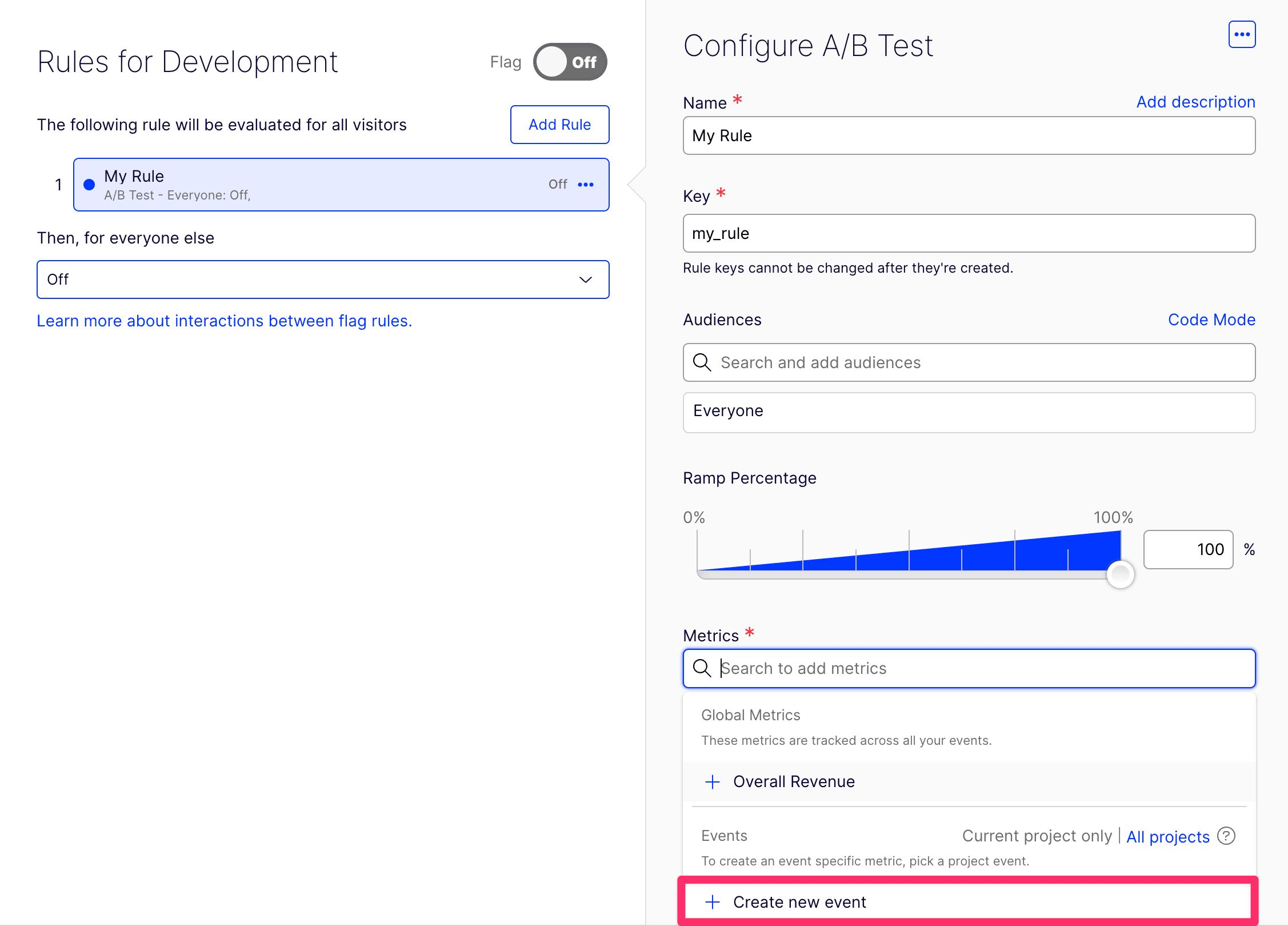 A critical part of configuring the Rule is adding an event that we can track to determine how each variantion is performing. This can be found under Metrics.