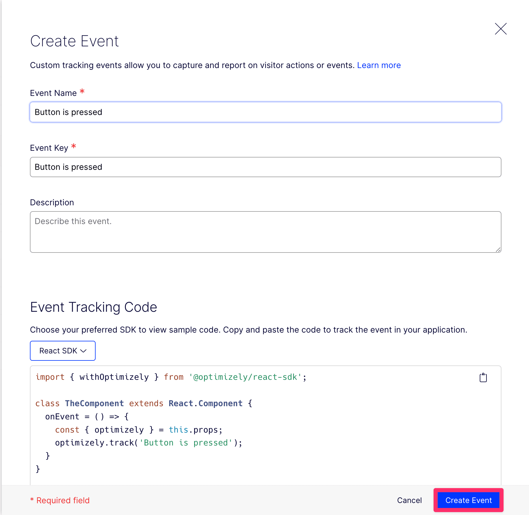 You can learn more on what events you can capture in the learn more under Create Event. For now, we are going to track when a button is pressed. We will name this event accordingly: "Button is pressed"