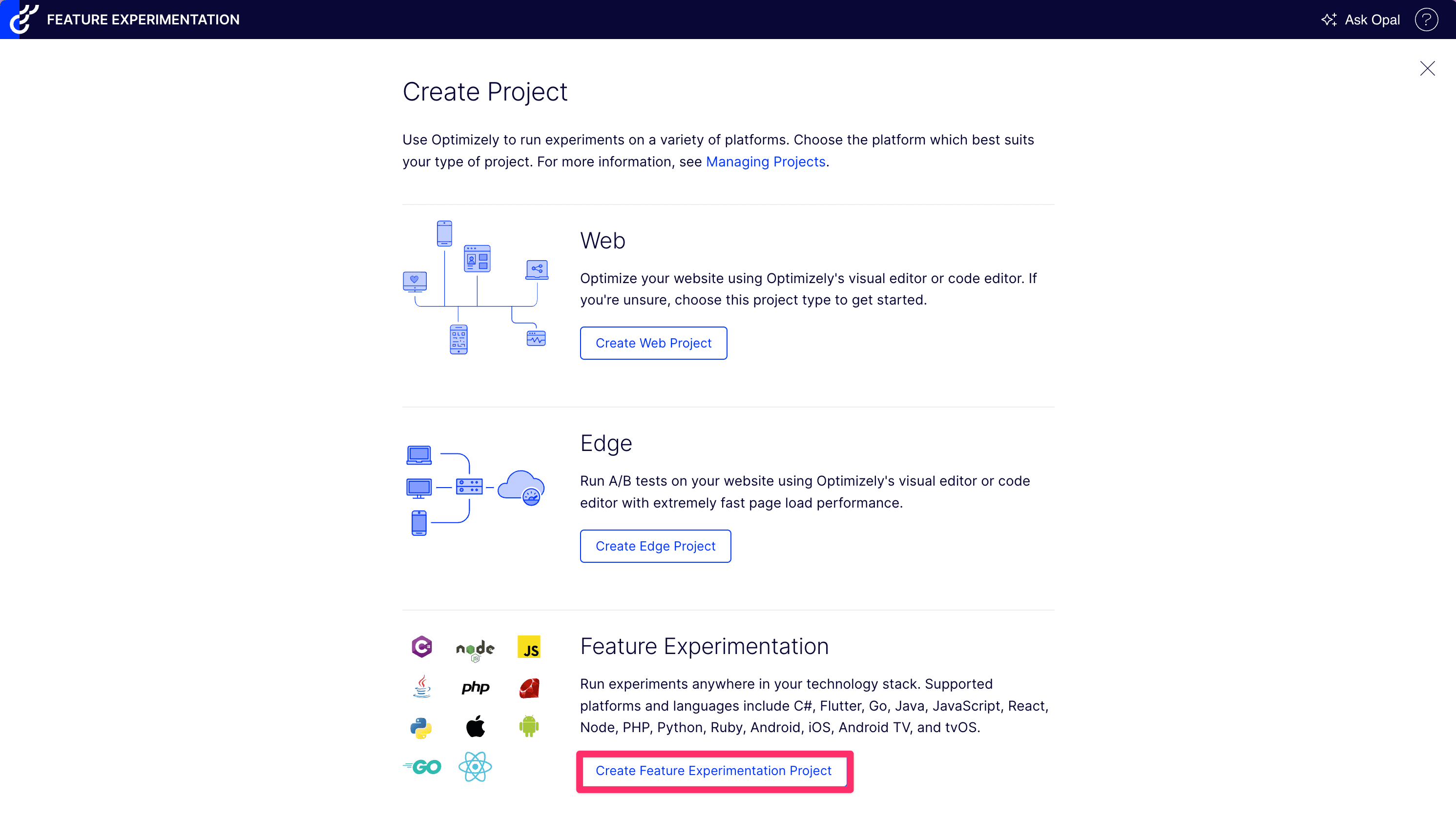 The first step will be to sign-up and access Optimizely. Once you’ve logged into Optimizely, the next step is to set up a new Feature Experimentation project, like so: